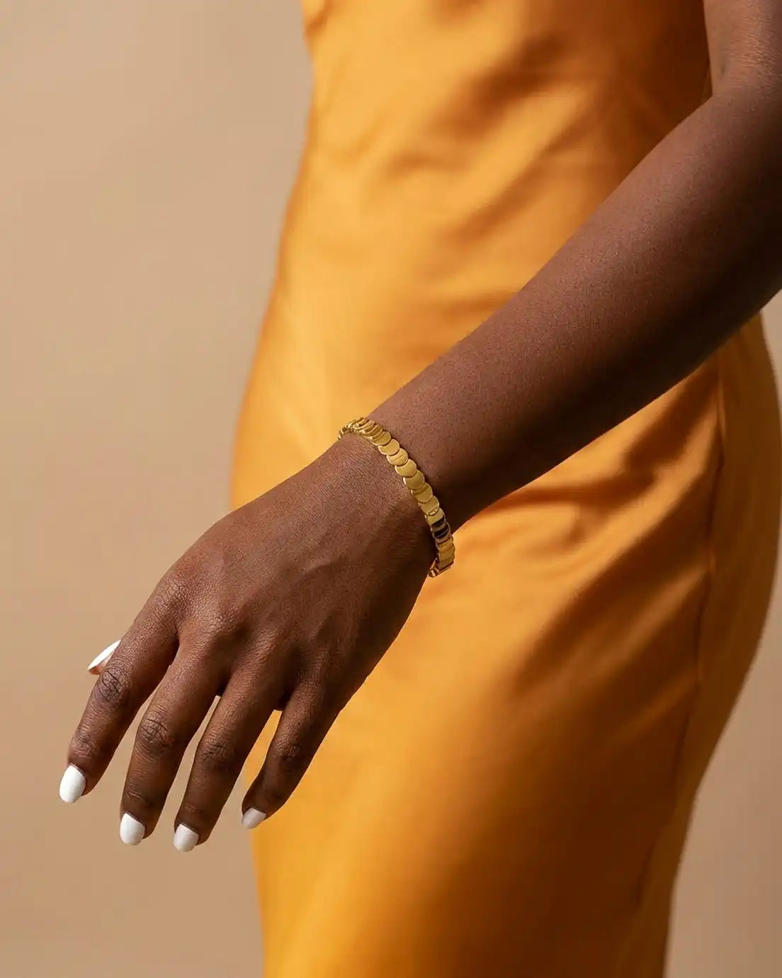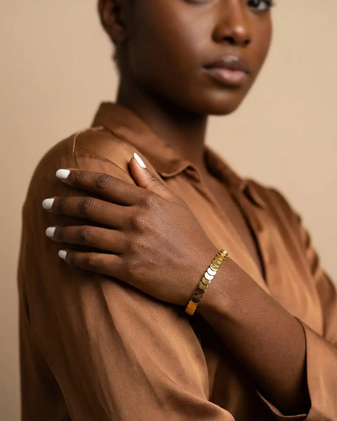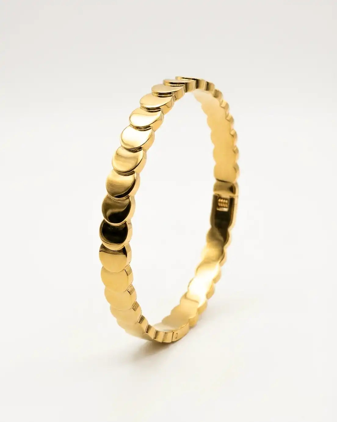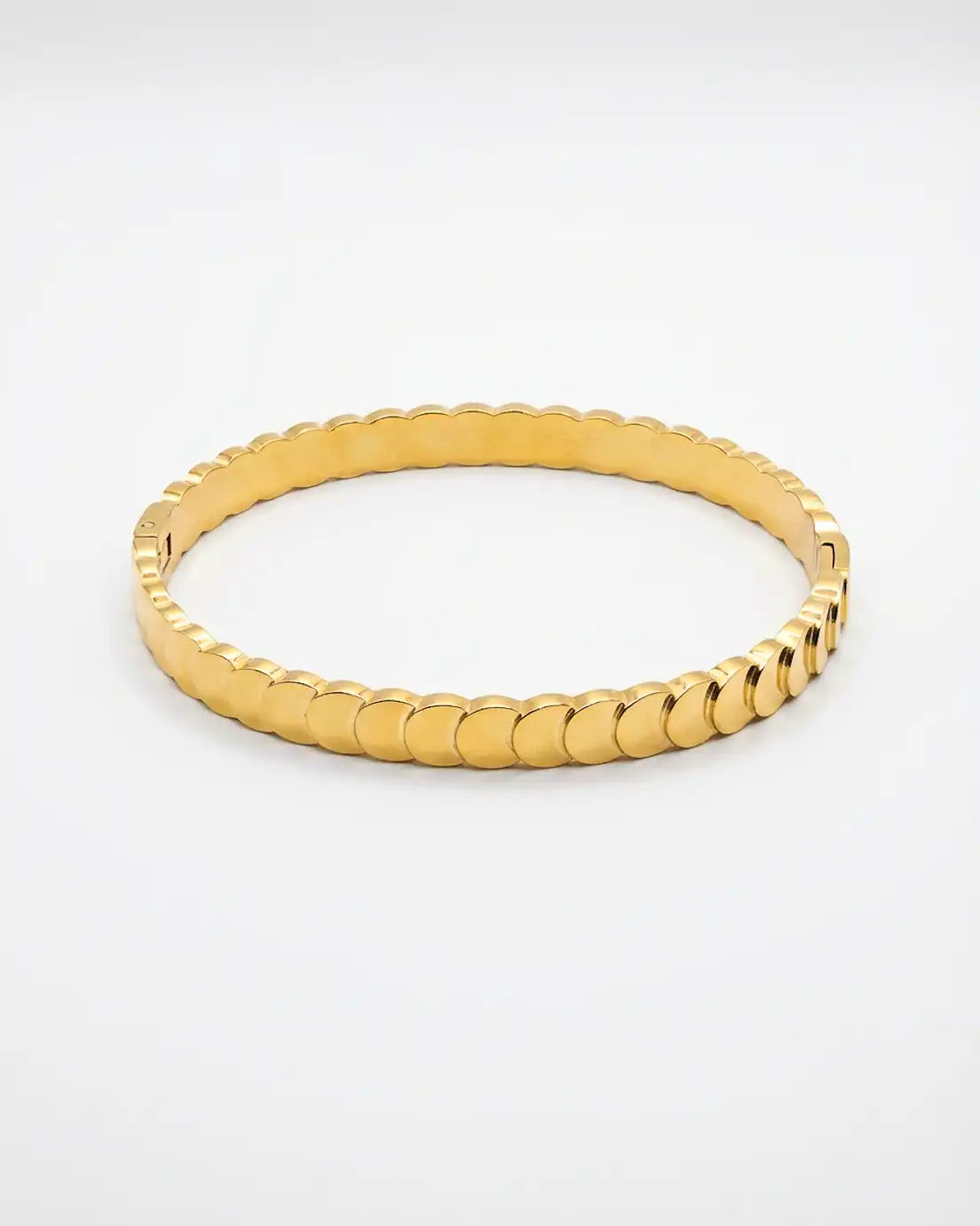 This is texture done right. Flat disc elements create dimensional interest that catches and reflects light with every gesture, giving you that polished, put-together look without any effort. The continuous pattern wraps elegantly around your wrist, substantial enough to make a statement yet refined enough for everyday wear. It’s the kind of piece that works with absolutely everything—from your sharpest blazer to your favorite weekend sweater. Wear it solo for sleek sophistication or stack it with other bangles for more impact.
