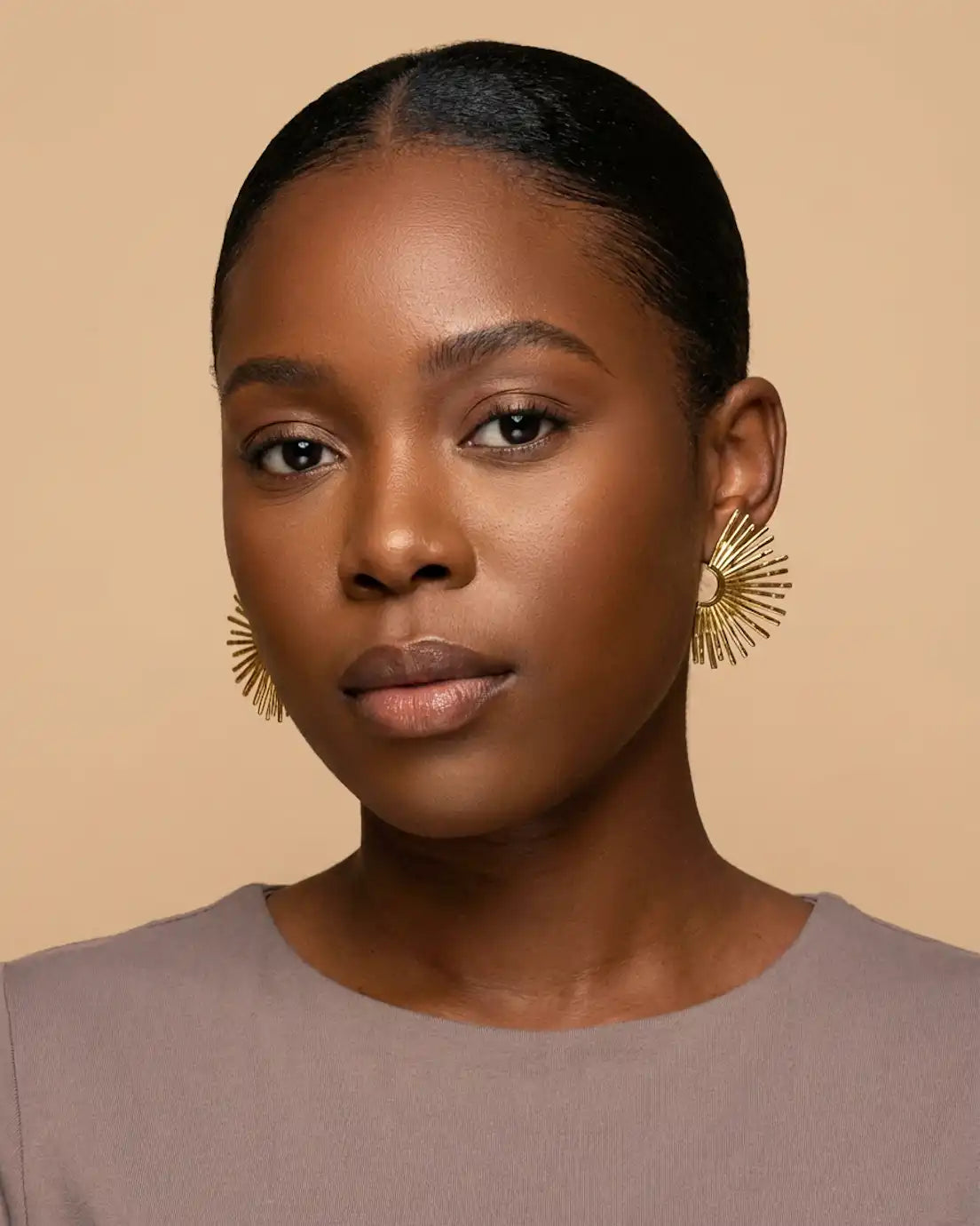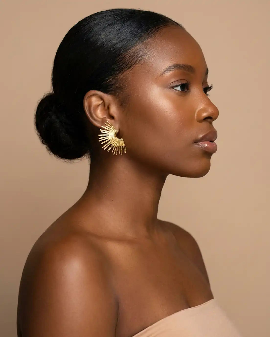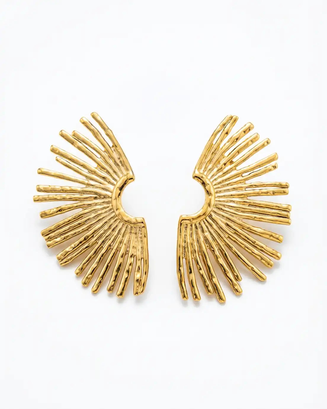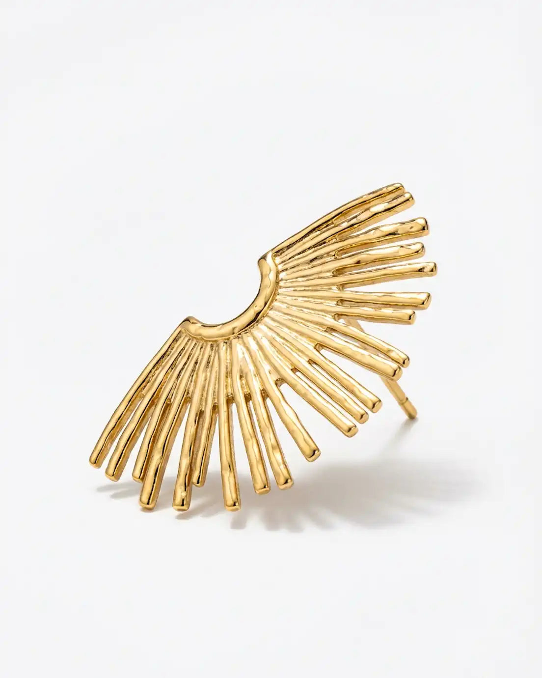 Like wearing sunshine. These dramatic sunburst studs radiate geometric rays that fan out beautifully, creating movement and dimension that catches every bit of light. The Art Deco-inspired design feels both vintage glamorous and completely modern. Despite their bold presence, they remain surprisingly wearable—lightweight enough for all-day comfort. Perfect with a sleek updo or swept-back hair to let them take center stage. They’re the kind of earrings that make people ask, “Where did you get those?”