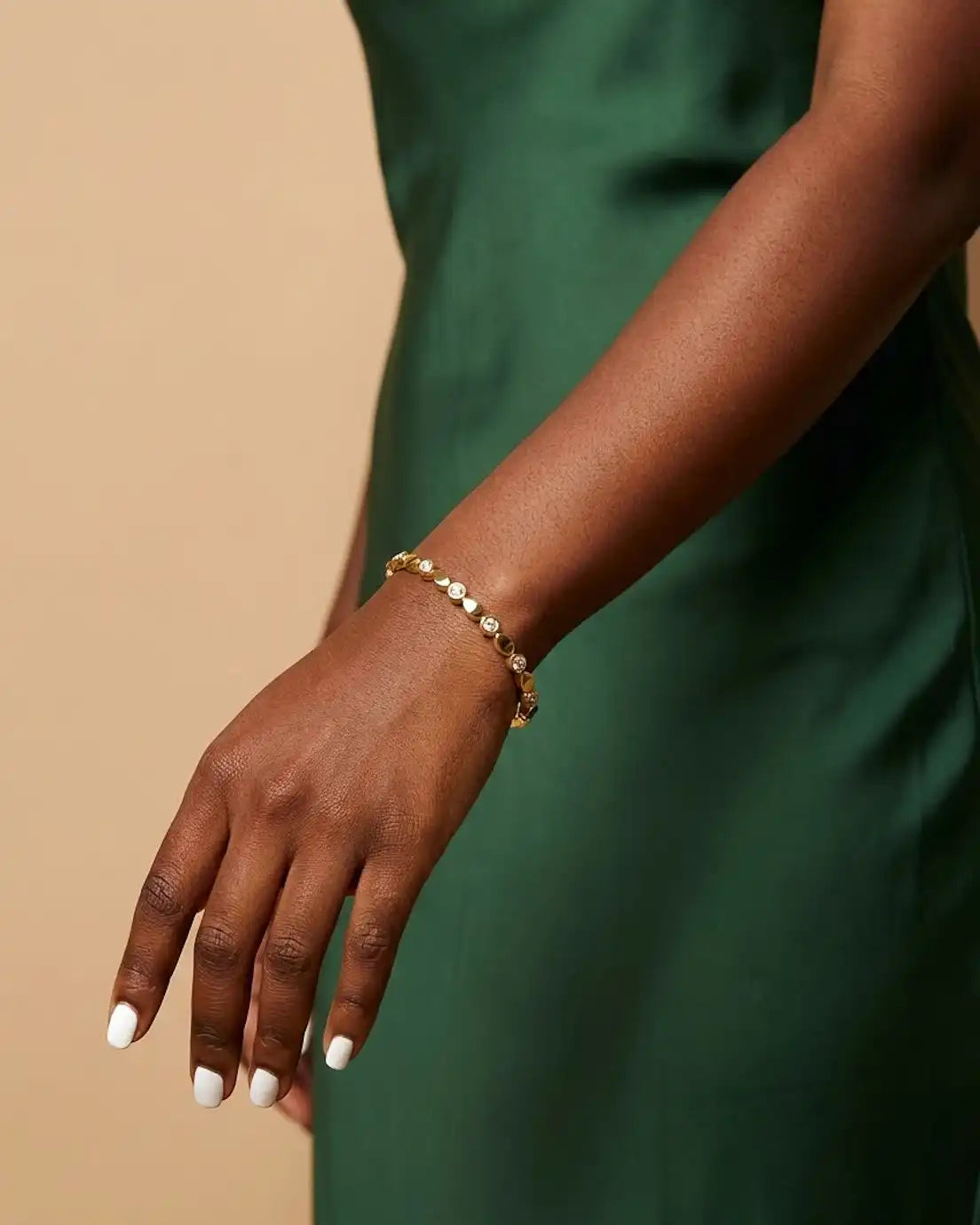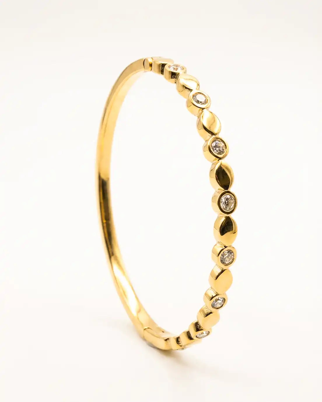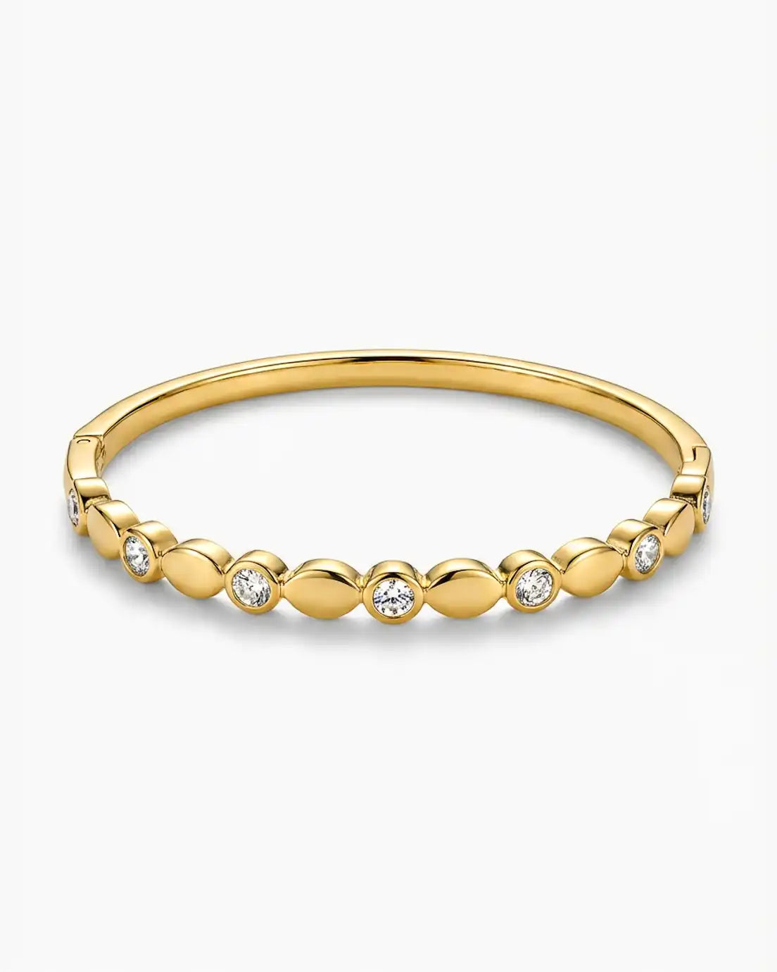This bangle brings organic beauty to a polished silhouette. Smooth petal-shaped elements alternate with bezel-set crystals, creating a rhythm that feels feminine and sophisticated at once. The dimensional design catches light beautifully, while the smooth inner band keeps it comfortable for all-day wear. It’s delicate enough to feel romantic yet substantial enough to stand alone. Perfect for that garden party, brunch date, or any moment when you want your jewelry to feel as thoughtful as you are.